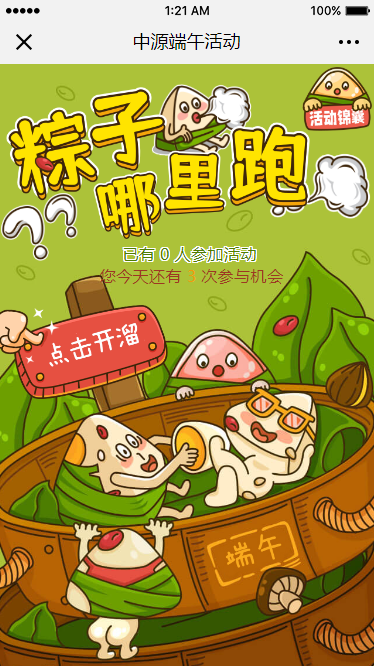 游戲玩法:把行走的粽子拖到下方,不要被筷子夾走哦!分數到達500分,即可獲得抽獎機會(huì ),每位用戶(hù)有三次參與機會(huì )。