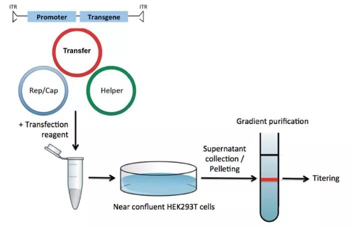 簡(jiǎn)而言之,您首先用攜帶目的基因的rAAV載體,腺病毒輔助質(zhì)粒和含有Rep和Cap的質(zhì)粒共轉染HEK293T細胞(圖2,通常稱(chēng)為“三重質(zhì)粒轉染”)。2-3天后,收集上清液(或在某些情況下需要制備細胞提取物,因為一些rAAV血清型被釋放到培養基中,而其他類(lèi)型則沒(méi)有)(Vandenberghe et al),使用PEG從中沉淀病毒粒子。然后使用高速的超速離心機通過(guò)密度梯度離心進(jìn)一步純化病毒顆粒。由于其密度很高,病毒粒子會(huì )在分離液中形成一條帶,你可以收集這條帶。然后通過(guò)透析/緩沖液交換去除密度梯度離心液,并且如果需要可以進(jìn)一步濃縮病毒粒子。