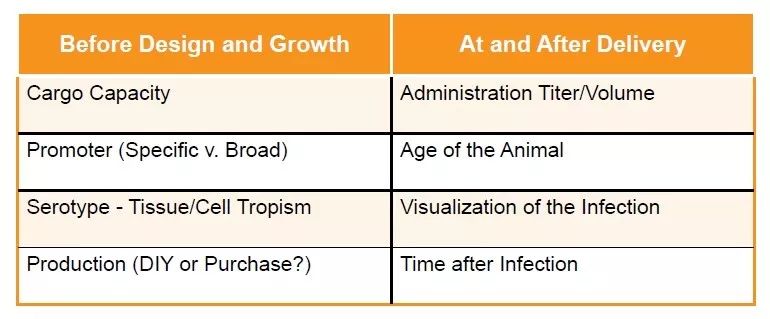 關(guān)于A(yíng)AV在體內的傳遞,有幾個(gè)因素是不同的,這取決于您選擇的生物系統。這些因素對感染的成功程度有很大的影響。無(wú)論您的應用是什么,下面列出的一些參數,您可能需要在注射病毒之前考慮:
