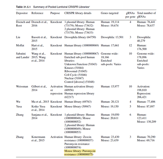 McDade, J.R., Waxmonsky, N.C., Swanson, L.E., and Fan, M. 2016.Practical considerations for using pooled lentiviral CRISPR libraries.