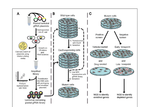 圖2備注:使用混合慢病毒 CRISPR 庫的實(shí)驗流程圖。 (A)gRNA 文庫的擴增與驗證以及慢病毒的產(chǎn)生。將質(zhì)粒 DNA 轉化至大腸桿菌中,并在含有相應抗生素的 LB 瓊脂平板上培養。通過(guò)對轉化樣本進(jìn)行稀釋培養可以估算轉化中的質(zhì)??倲担ɡ?,稀釋培養法)。從轉化的大腸桿菌中分離出擴增的庫并進(jìn)行 NGS 檢測,以比較擴增庫與原始庫存的代表情況。然后將擴增且經(jīng)過(guò)驗證的庫轉染至帶有適當包裝和包膜質(zhì)粒的標準HEK細胞或慢病毒包裝細胞系中,以生成慢病毒 gRNA 庫(含 Cas9)。 (B)通過(guò)單個(gè) gRNA 與 Cas9 的共表達生成突變細胞。對于多載體 CRISPR 庫,必須在轉染 gRNA 庫之前先生成一個(gè)表達 Cas9 的穩定細胞系(實(shí)線(xiàn))。對于單載體庫,可以直接從野生型細胞一步生成突變細胞(虛線(xiàn))。無(wú)論哪種情況,使用 gRNA 庫進(jìn)行轉導時(shí)的摩爾濃度必須較低(<1),以確保每個(gè)細胞僅含有單一的 gRNA(每一步中減少的培養板數量表明,隨著(zhù)每次篩選的進(jìn)行,細胞總數會(huì )減少)。(c)使用 CRISPR 工程突變細胞進(jìn)行篩選?;旌螩RISPR文 庫與陽(yáng)性篩選或陰性篩選兼容。在陽(yáng)性篩選(如藥物耐藥性篩選)中,突變細胞會(huì )接受藥物或載體對照處理,并使用 NGS 來(lái)識別能賦予藥物耐藥性的 gRNA(即基因)。在陰性篩選(如細胞存活篩選)中,突變細胞會(huì )在有限的時(shí)間內生長(cháng),并使用 NGS 來(lái)識別與初始時(shí)間點(diǎn)相比在較晚時(shí)間點(diǎn)減少的基因。