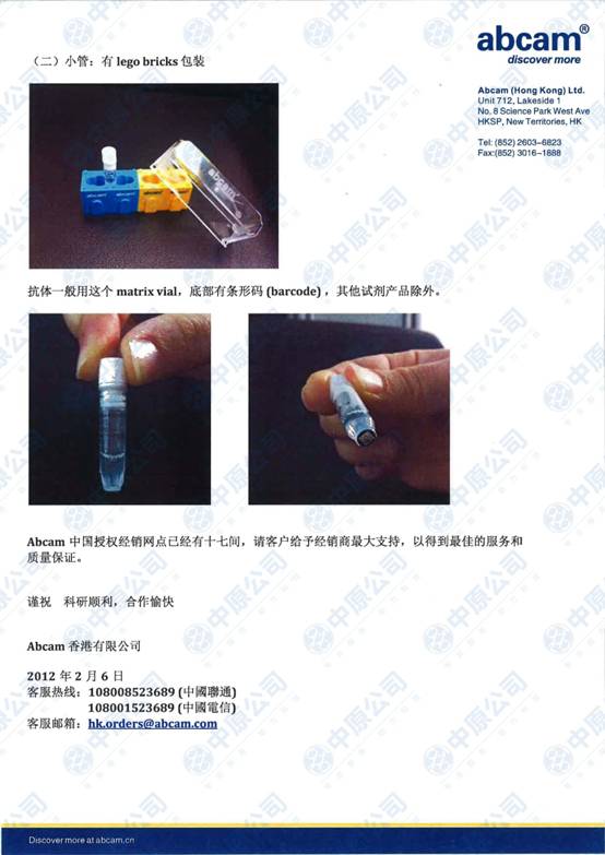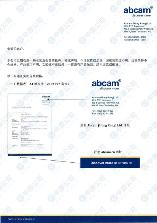 近期,Abcam公司收到一些水貨及假貨的投訴,這種產(chǎn)品,因進(jìn)貨渠道不明,運輸條件不合規格,產(chǎn)品效用不明,從而導致一些實(shí)驗做不出結果。在此,Abcam特此聲明,這類(lèi)產(chǎn)品一律沒(méi)有產(chǎn)品保證,不退款或換貨,請從正規渠道訂購。